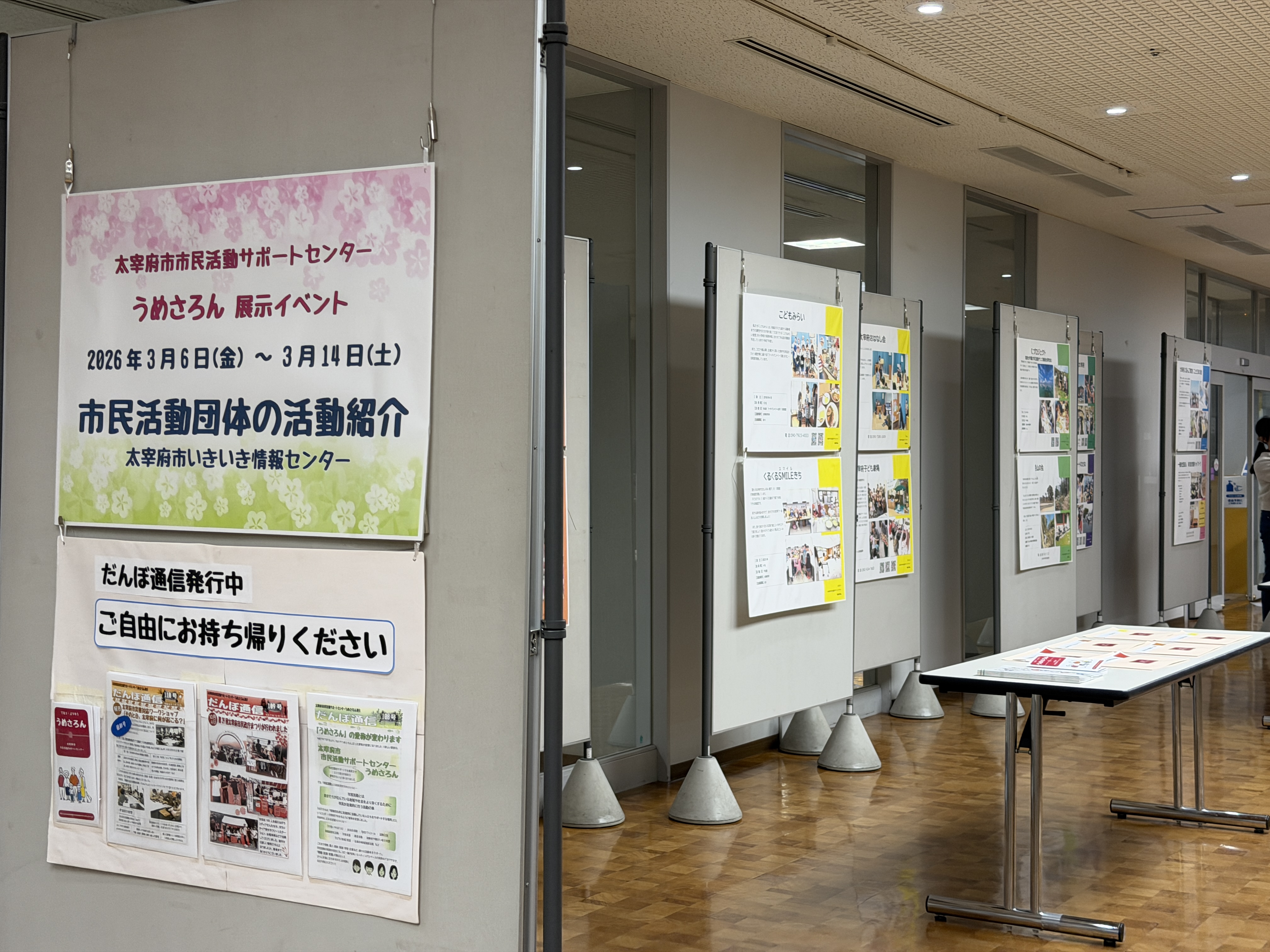 「市民活動団体の活動紹介」パネル展示イベント ◇うめさろん展示イベント開催中◇ 2026年3月6日(金)~3/14(土) 太宰府市いきいき情報センターにて 「市民活動団体の活動紹介」 パネル展示イベントを開催中です! 様々な分野で活動している団体が太宰府市には数多くあります。 ぜひ、いきいき情報センターに来られてゆっくりとご覧ください。 【予告】 2026年3月16日(月)~3/27(金)は 太宰府市役所にて 同じく「市民活動団体の活動紹介」の パネル展示をいたします。